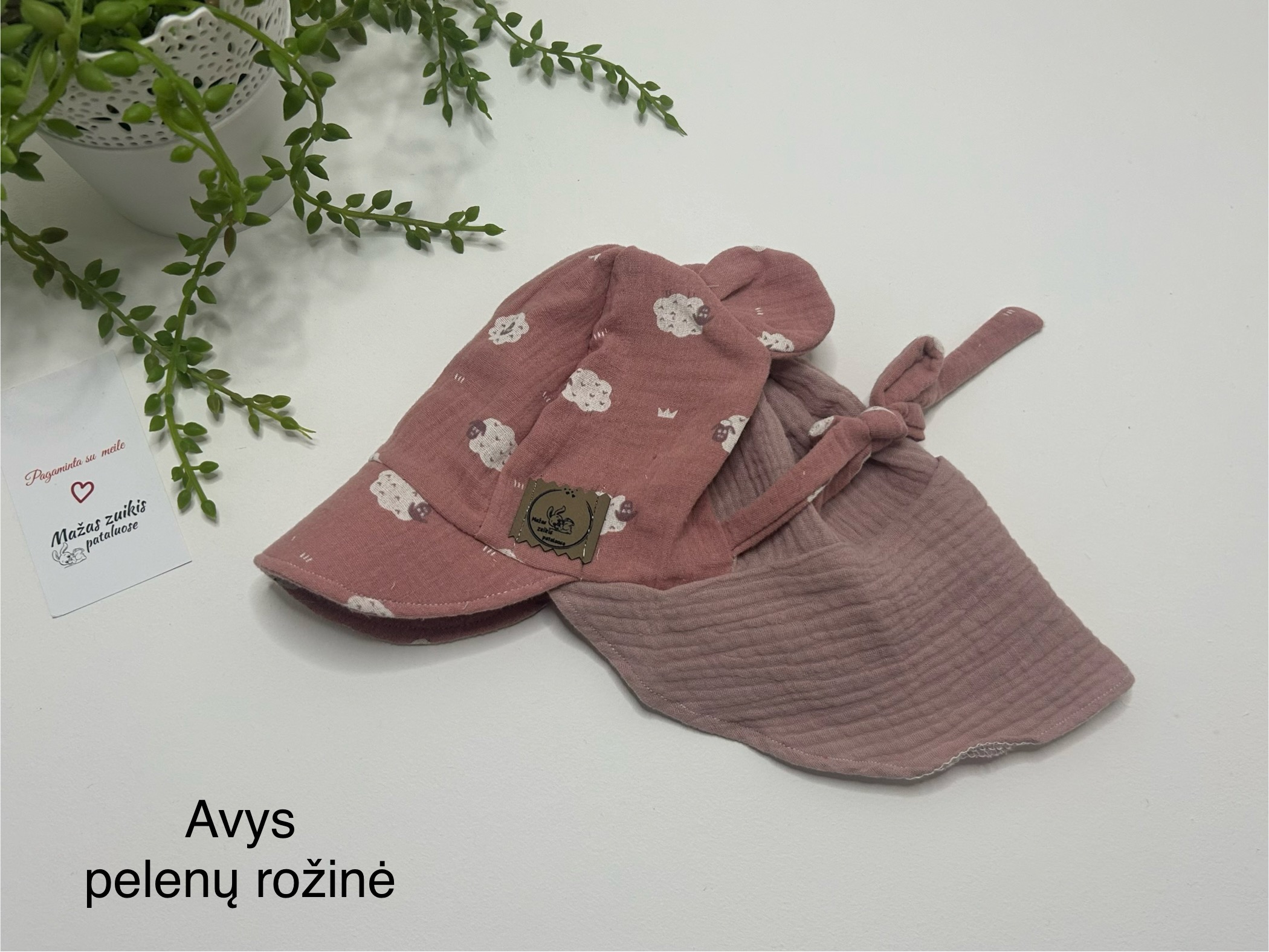 Muslino kepurė su snapeliu ir kaklo apsauga 6-12mėn “Avytės”