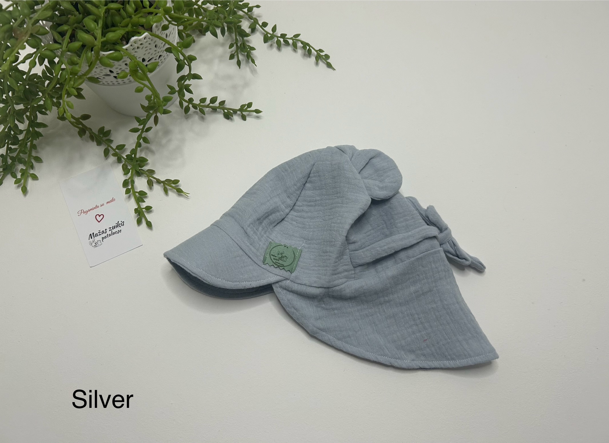 Muslino kepurė su snapeliu ir kaklo apsauga 6-12mėn “silver”