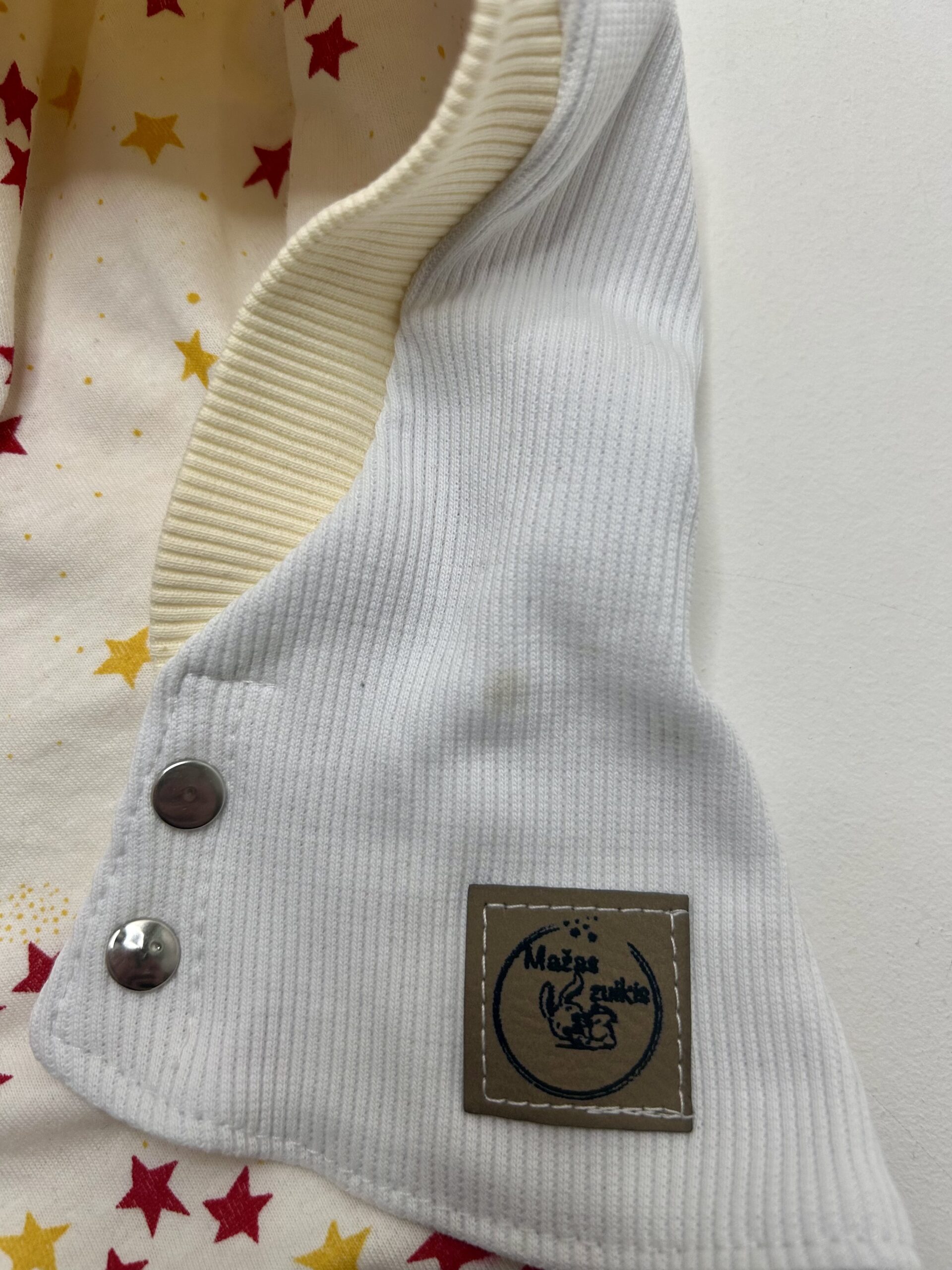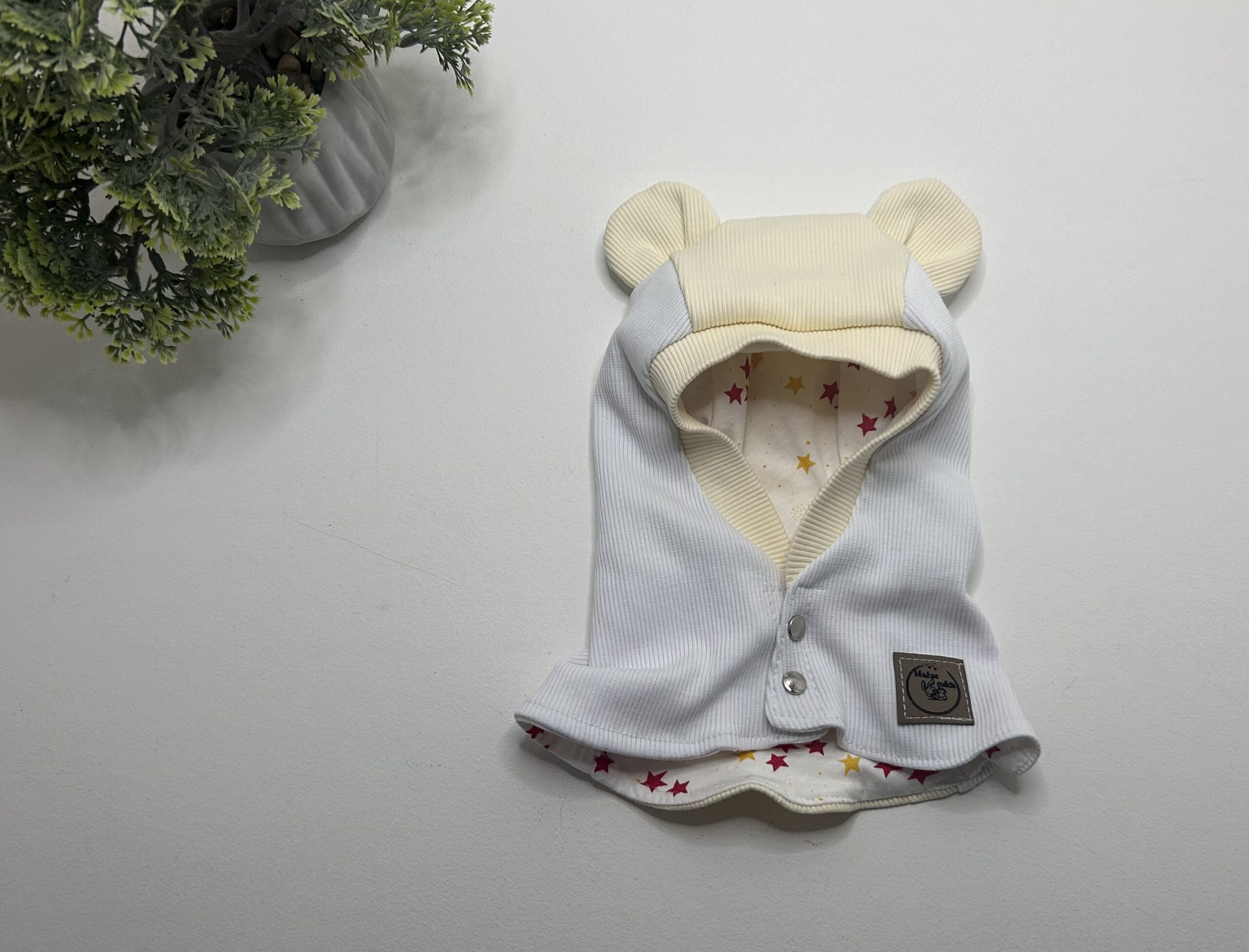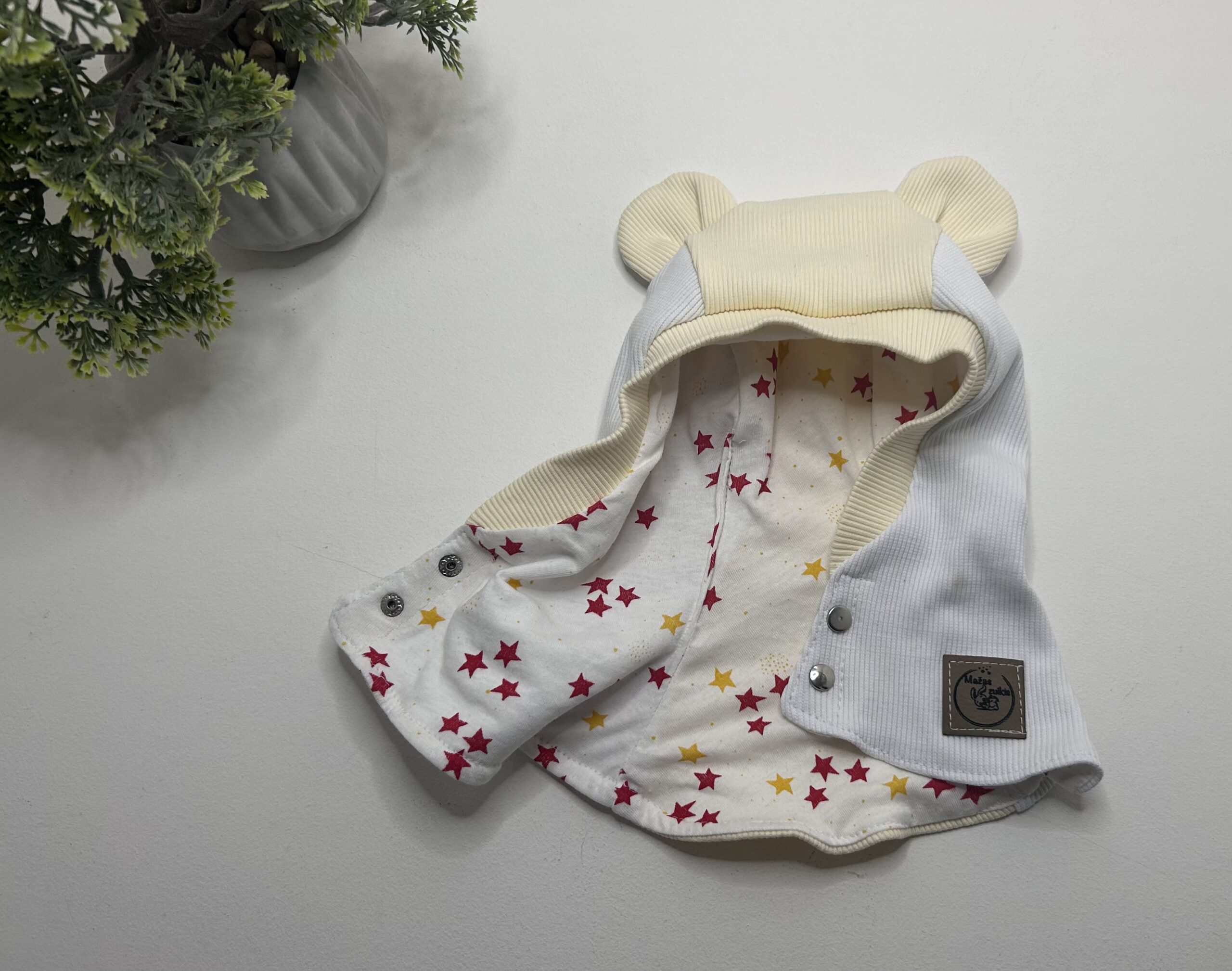 Šalmukas su spaudėmis pasiūtas iš dviejų sluoksnių audinio, tinkamas rudeniui/pavasariui.